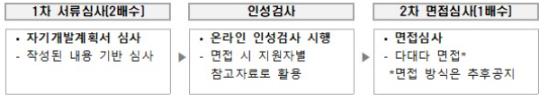 - 1차 서류심사를 통해 2배수를 선발하고, 서류합격자 대상 온라인 인성검사 시행(면접 시 참고자료로 활용), 2차 면접심사 결과 고득점자 순으로 최종대상자 선발