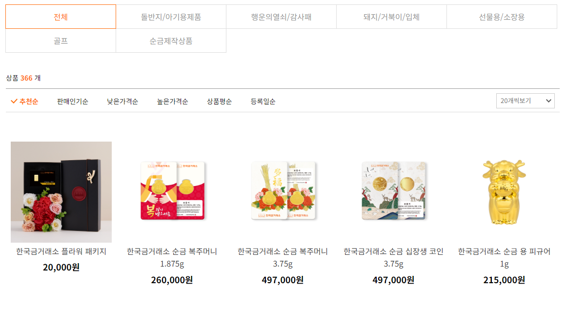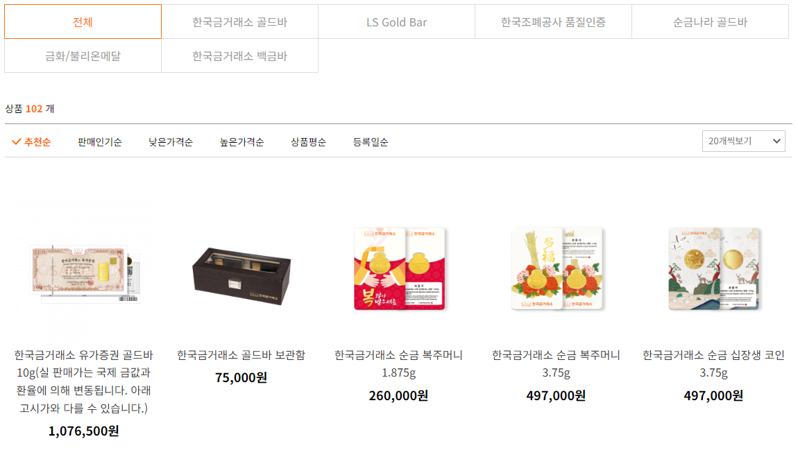 뿐만 아니라 골드바, 실버바, 순금제품, 금화은화, 선물용/순금기념품 메뉴에는 다양한 금상품이 진열되어 있습니다.