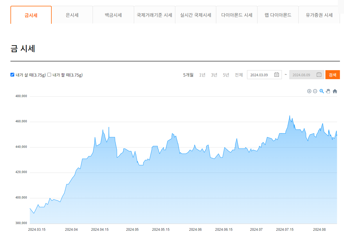 최근 5개월부터 최장 5년까지의 금시세를 그래프로 알 수 있습니다.