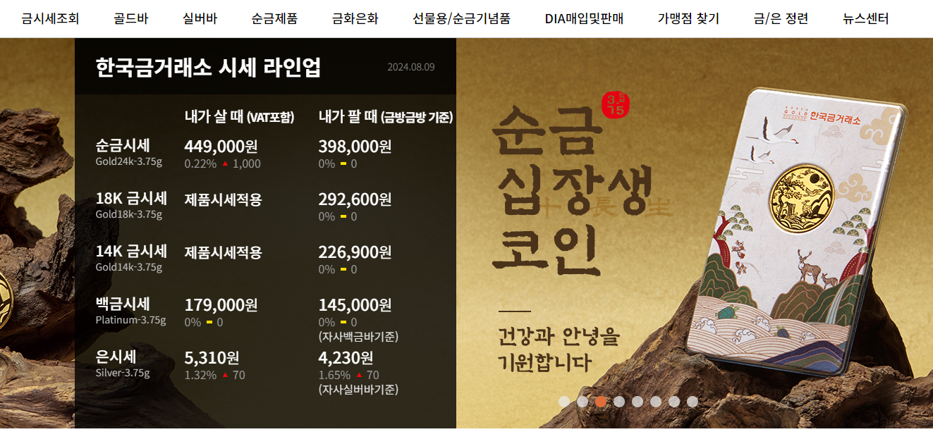 메뉴에는 금시세조회, 골드바, 실버바, 순금제품, 금화은화, 선물용/순금기념품, DIA매입및판매, 가맹점 찾기, 금/은 정련 등이 있습니다.