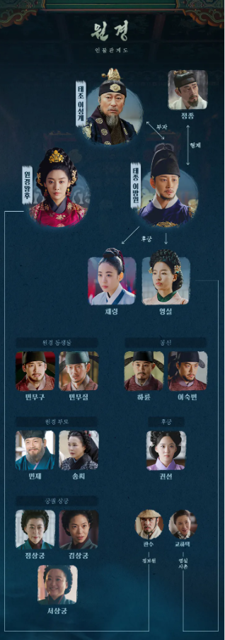 - 차주영 : 원경왕후 역 - 고려 재상지종 15개 가문 중의 하나인 여흥 민씨 민제의 딸로 태어났다. 아름답고 총명하며 자존감, 자의식이 강한 주체적 여성이다. 왕이 된 방원과 끊임없는 갈등을 겪지만, 단 한 번도 타협하거나 꺾이지 않는다. 뛰어난 정치 감각을 갖고 있으며, 이후 태종 이방원이 왕으로 자리를 잡아가는 과정에서 큰 결단을 내려, 그가 조선의 기틀을 다지도록 돕는다.