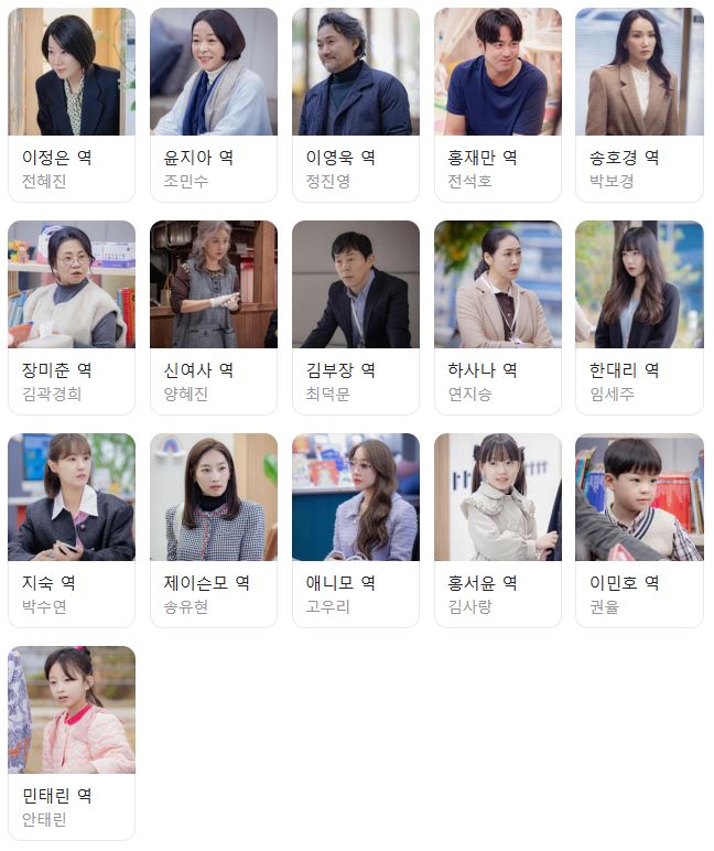 - 지아(조민수): 정은의 어머니로, 황혼 육아를 경험합니다. 그녀는 딸과 손녀 사이에서의 갈등을 해결하기 위해 노력합니다.