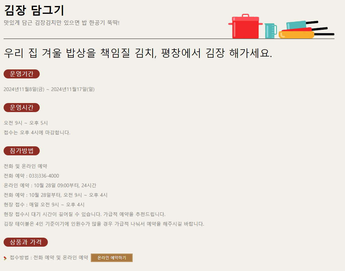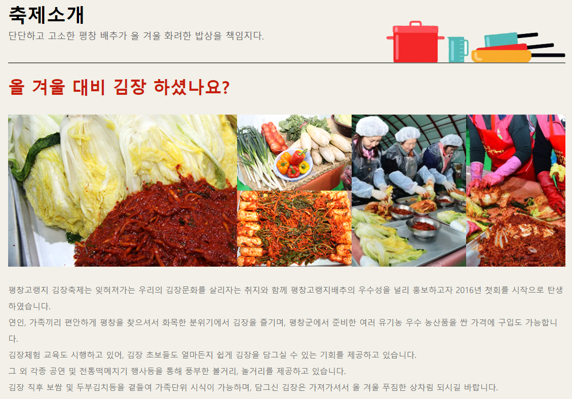 2024년 평창고랭지김장축제는 한국의 전통 문화를 체험하고, 가족과 함께 소중한 추억을 만들 수 있는 기회입니다. 많은 관심과 참여 부탁드립니다!