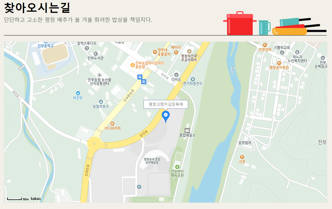 축제는 평창 송어 양식장 일원에서 개최됩니다. 이곳은 수려한 자연경관과 함께 김장체험을 즐기기에 최적의 장소입니다. 특히, 송어를 구경할 수 있는 기회도 주어져 아이들과 함께 방문하면 더욱 즐거운 경험이 될 것입니다.