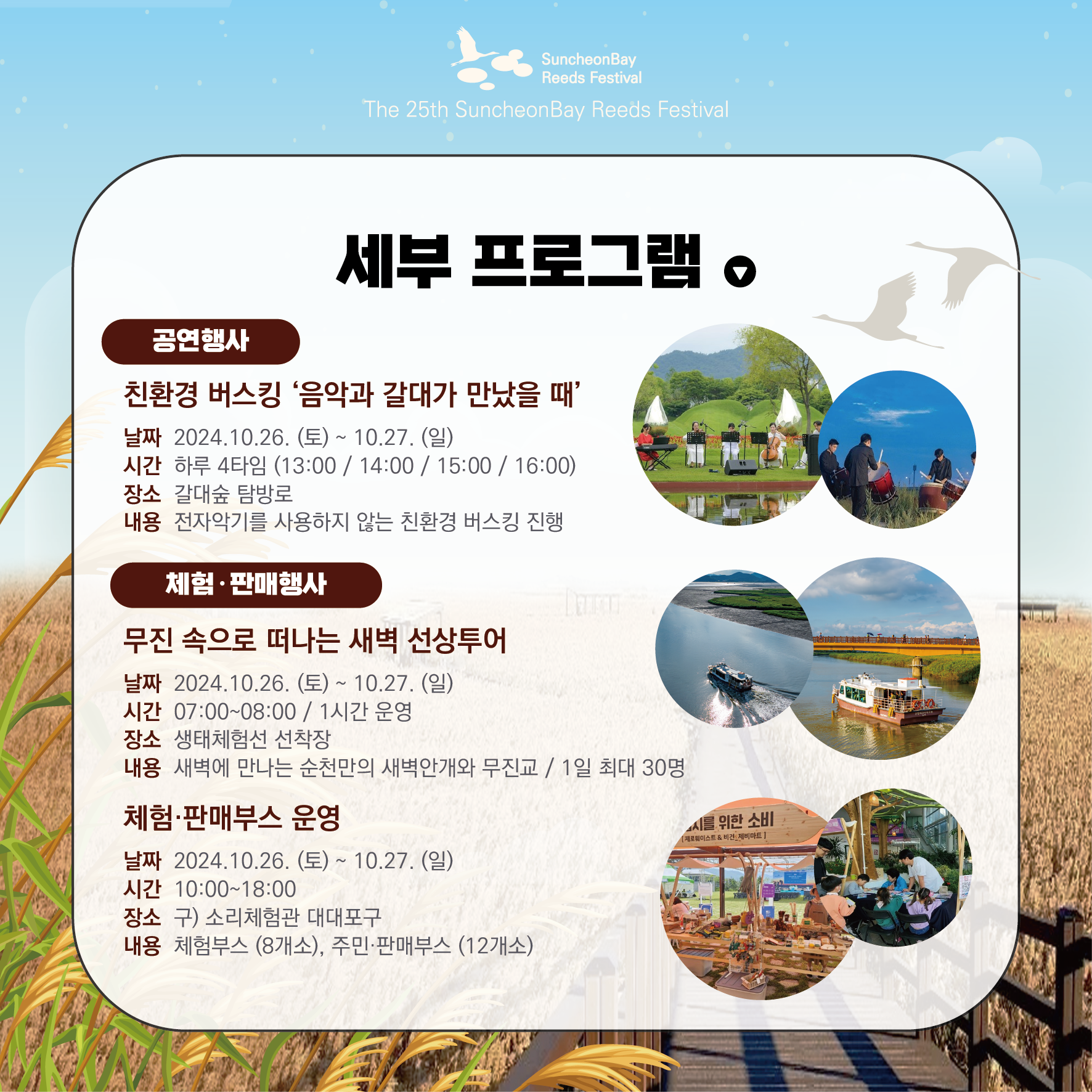 축제 기간 동안에는 다양한 프로그램이 진행됩니다. 갈대의 속삭임을 주제로 한 자연 명상, 갈대와 함께하는 음악 공연, 그리고 다양한 체험 부스가 마련되어 있습니다. 특히, 갈대밭을 배경으로 한 포토존은 인생 사진을 남기기에 최적의 장소입니다. 또한, 지역 특산물을 활용한 먹거리 장터도 운영되어, 순천의 맛을 느낄 수 있는 기회가 될 것입니다.