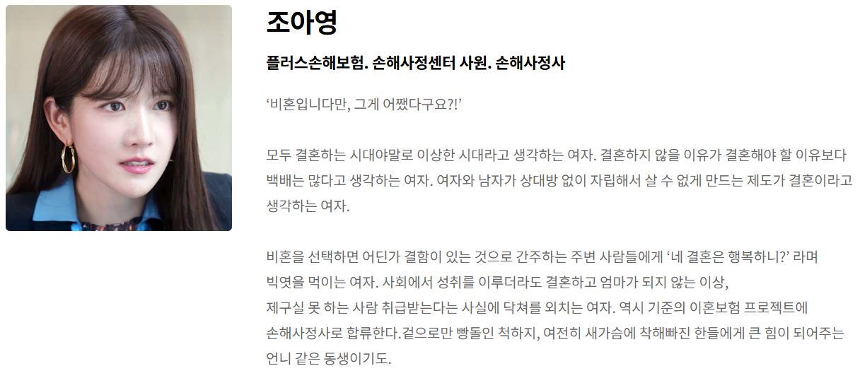 - 강한들(이주빈) : 플러스손해보험-보험심사부 언어라이터. 세상 눈치란 눈치는 다 보고 산 여자. 세상 보수적이고 권위적인 부모님 밑에서 순종이 최고의 인생 덕목인 줄 알고 컸다. 결혼한 지 5년, 남편이 바람폈는데 이혼을 당했다. 마냥 착하게만 살았던 강한들은 미친 짓 끝에 이혼을 하게 됐다. 이번에 새로 개발하는 이혼보험 프로젝트의 언더라이터로 참여해 실패를 바탕으로, 새로운 방식의 관계를 그려나간다.
